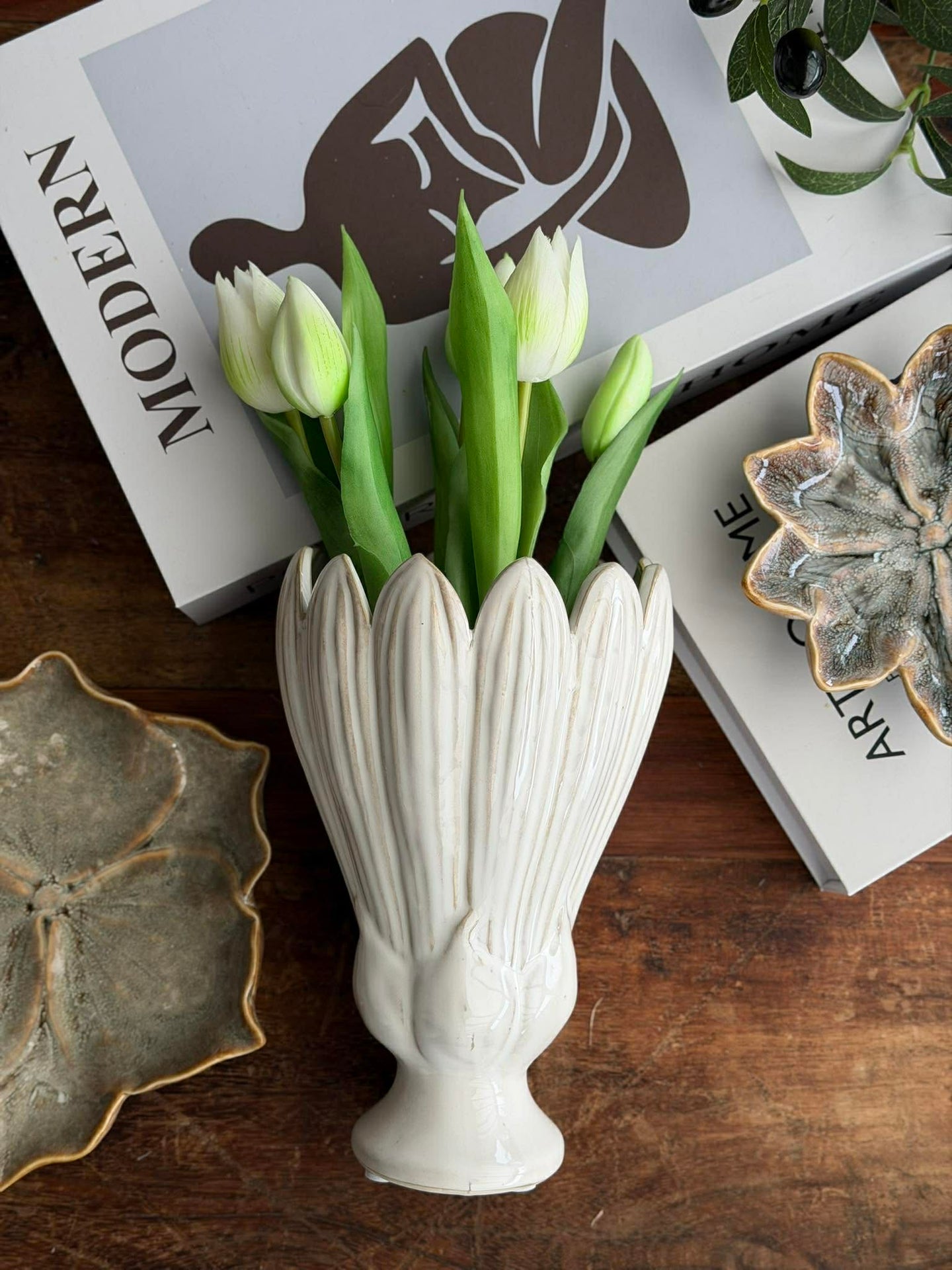 Vasen er laget i keramikk og holdt i en ren hvit farge. Det gjør den egnet når du ønsker en klassisk og diskret base for både blomster og grønne planter.