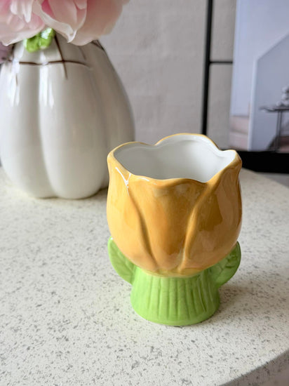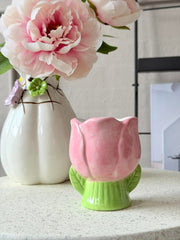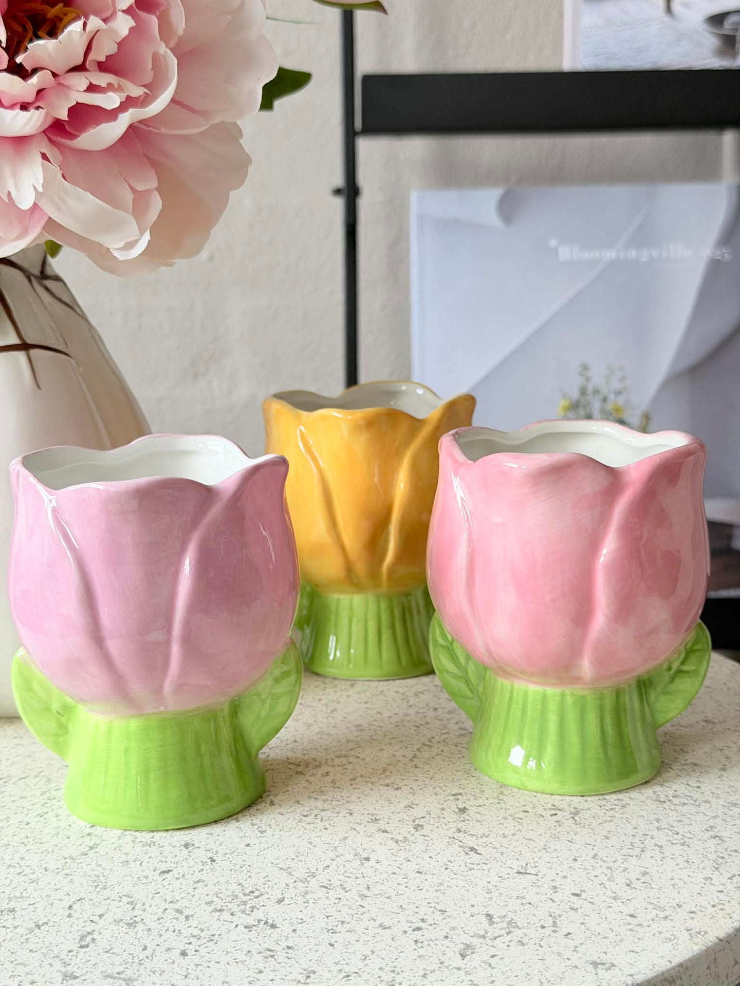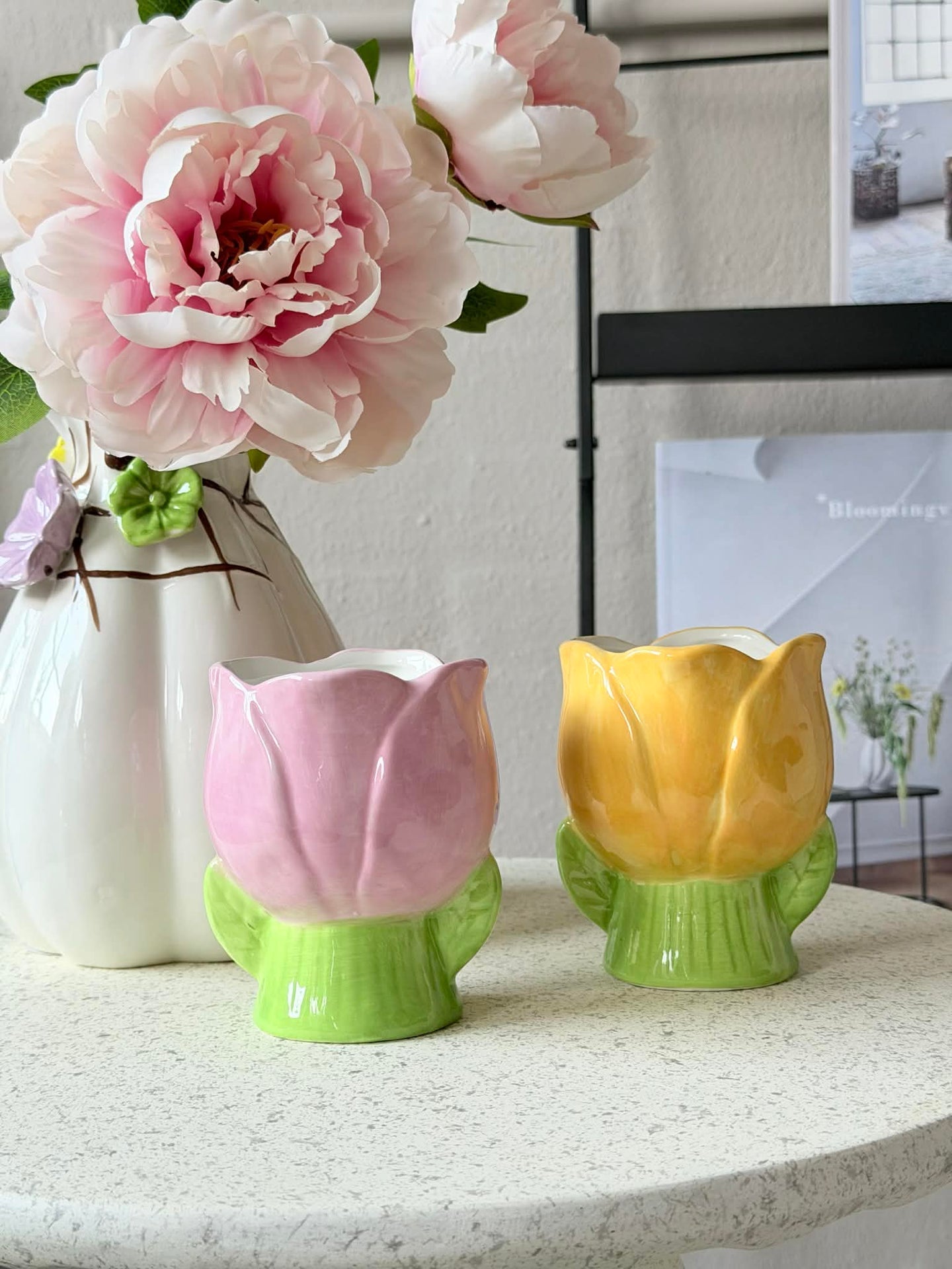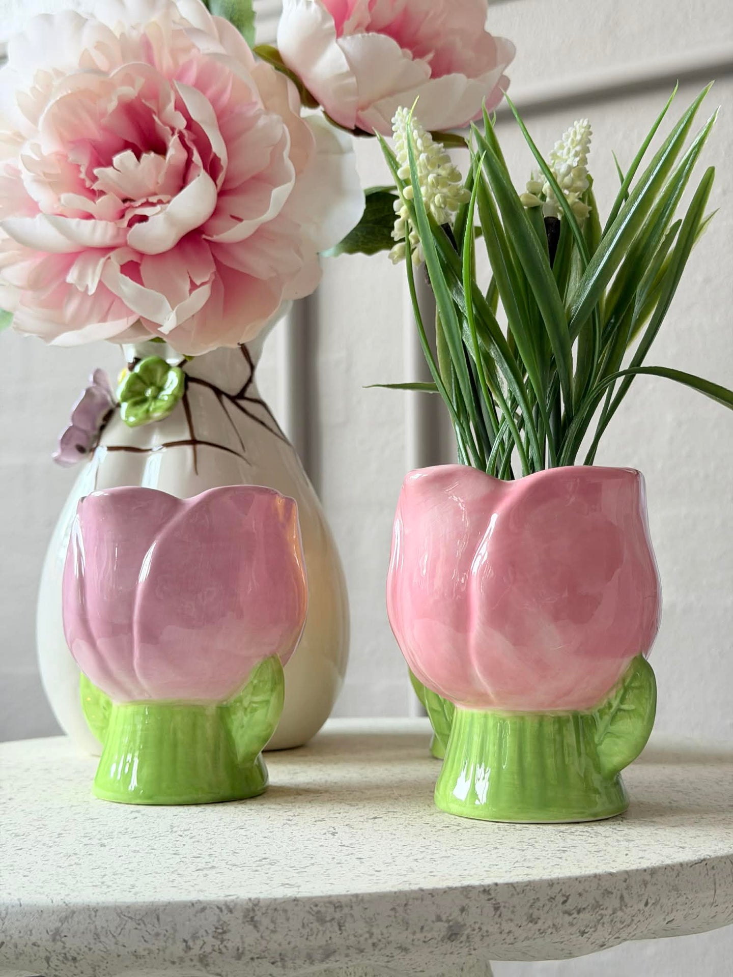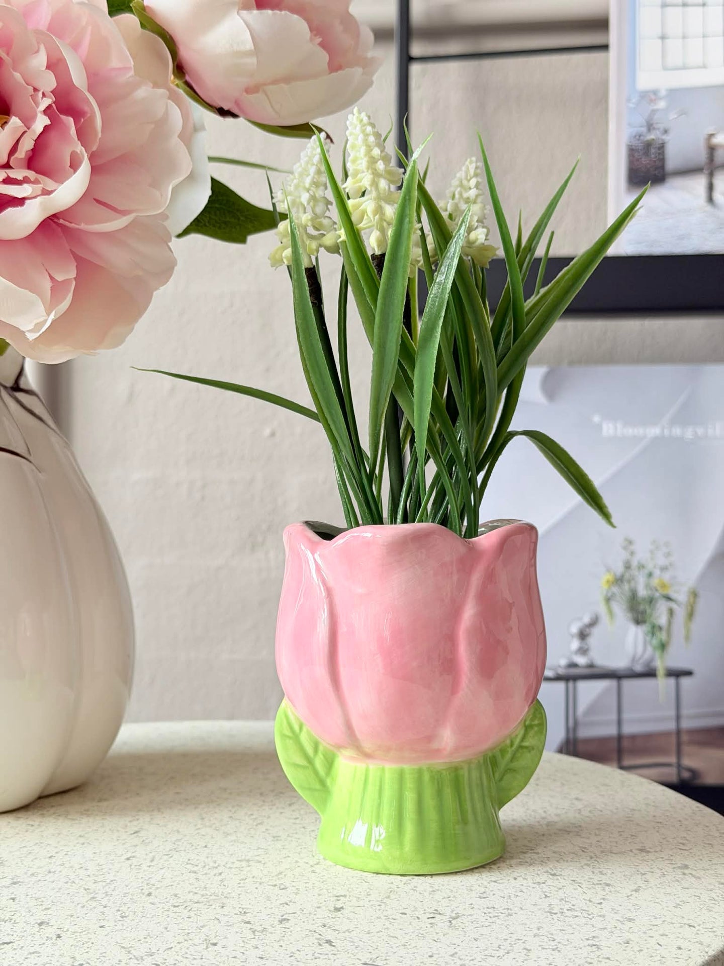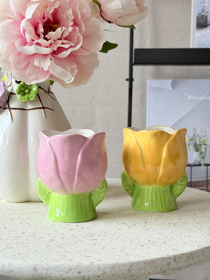Urtepotten er utført i keramikk og har et tulipaninspirert design som understreker det fine, sesongpregede uttrykket.