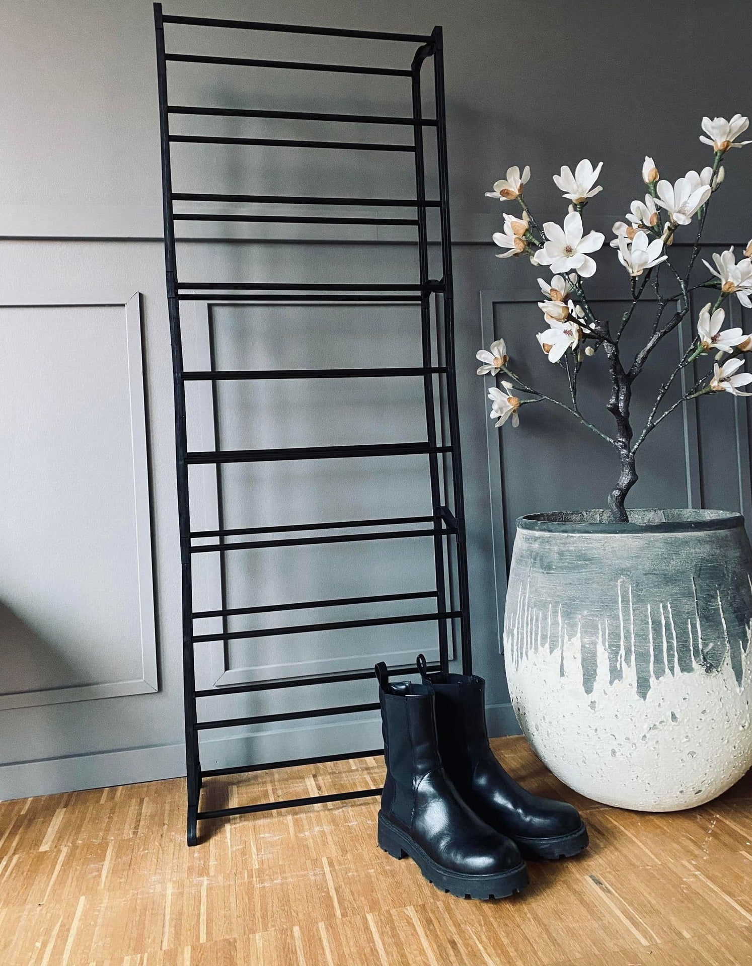 Skohyllen, laget av lett svart plast, gir en praktisk og stilren løsning for organisering av sko i gangen. Materialet gjør hyllen enkel å flytte og justere etter behov, samtidig som den er slitesterk og enkel å rengjøre. Den svarte fargen tilfører et moderne preg som passer inn i ulike interiørstiler, og gir et ryddig og samlet uttrykk i rommet.