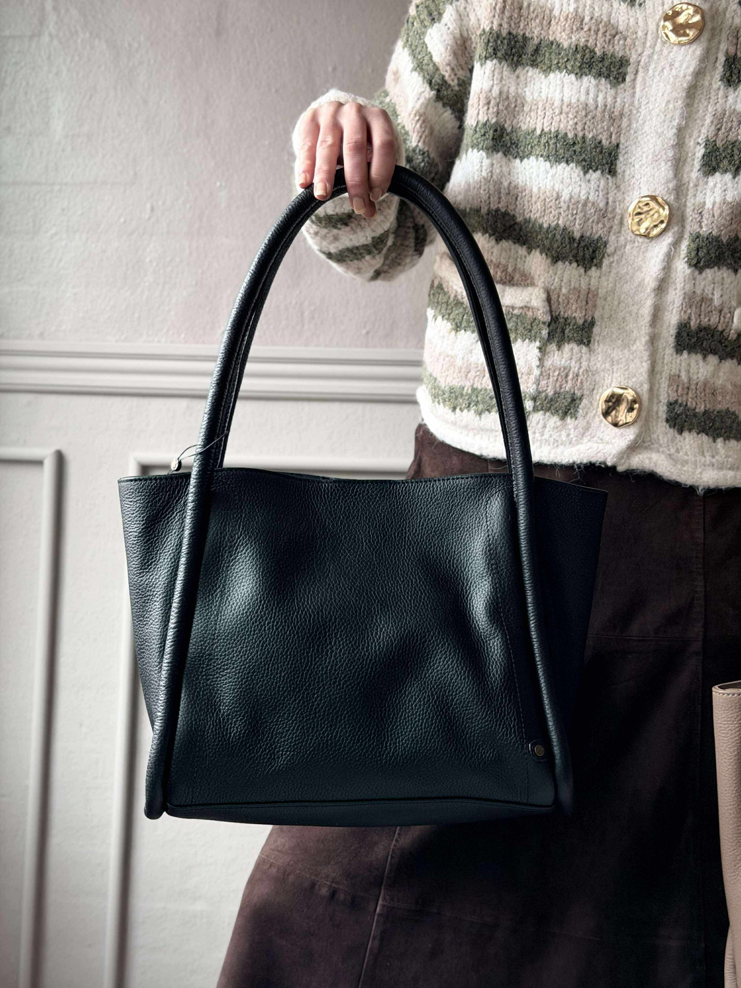 Foresett deg en hverdag uten rot i vesken. Med vår elegante skulderveske i koskinn kan du enkelt organisere nødvendighetene dine, uansett hvor du er. Opplev friheten av å finne det du trenger uten stress, og nyt en mer strukturert og stilfull livsstil på farten.