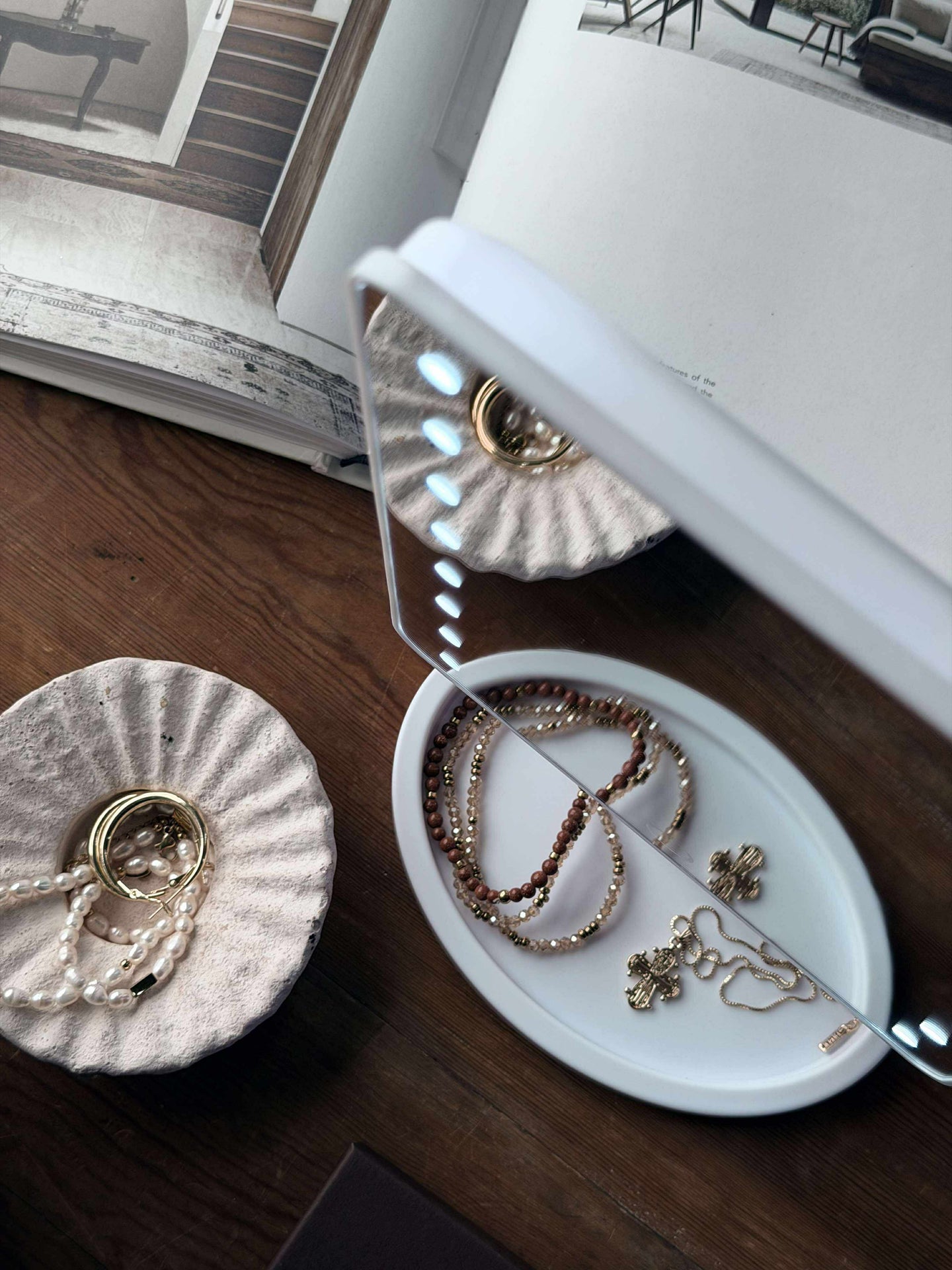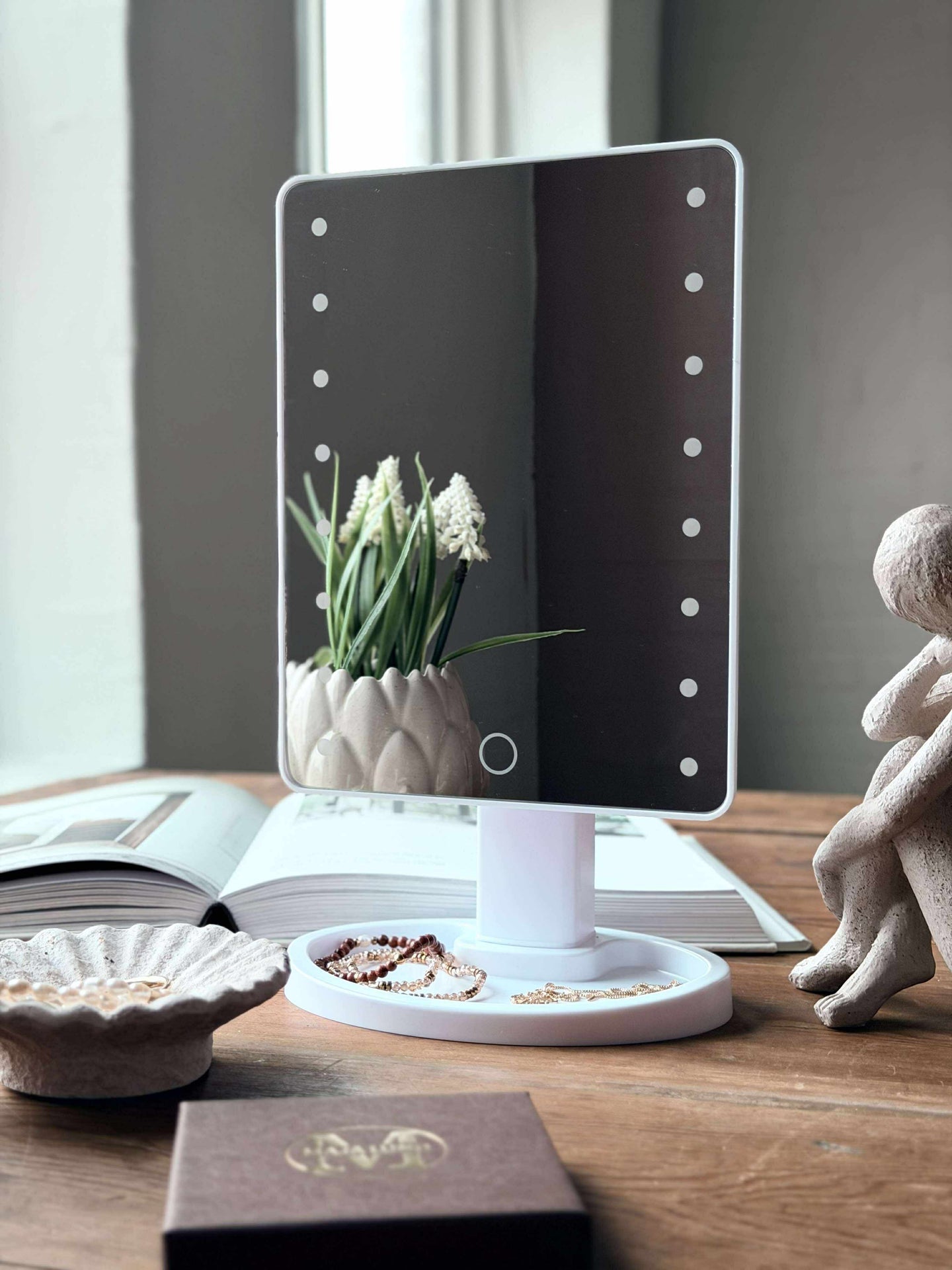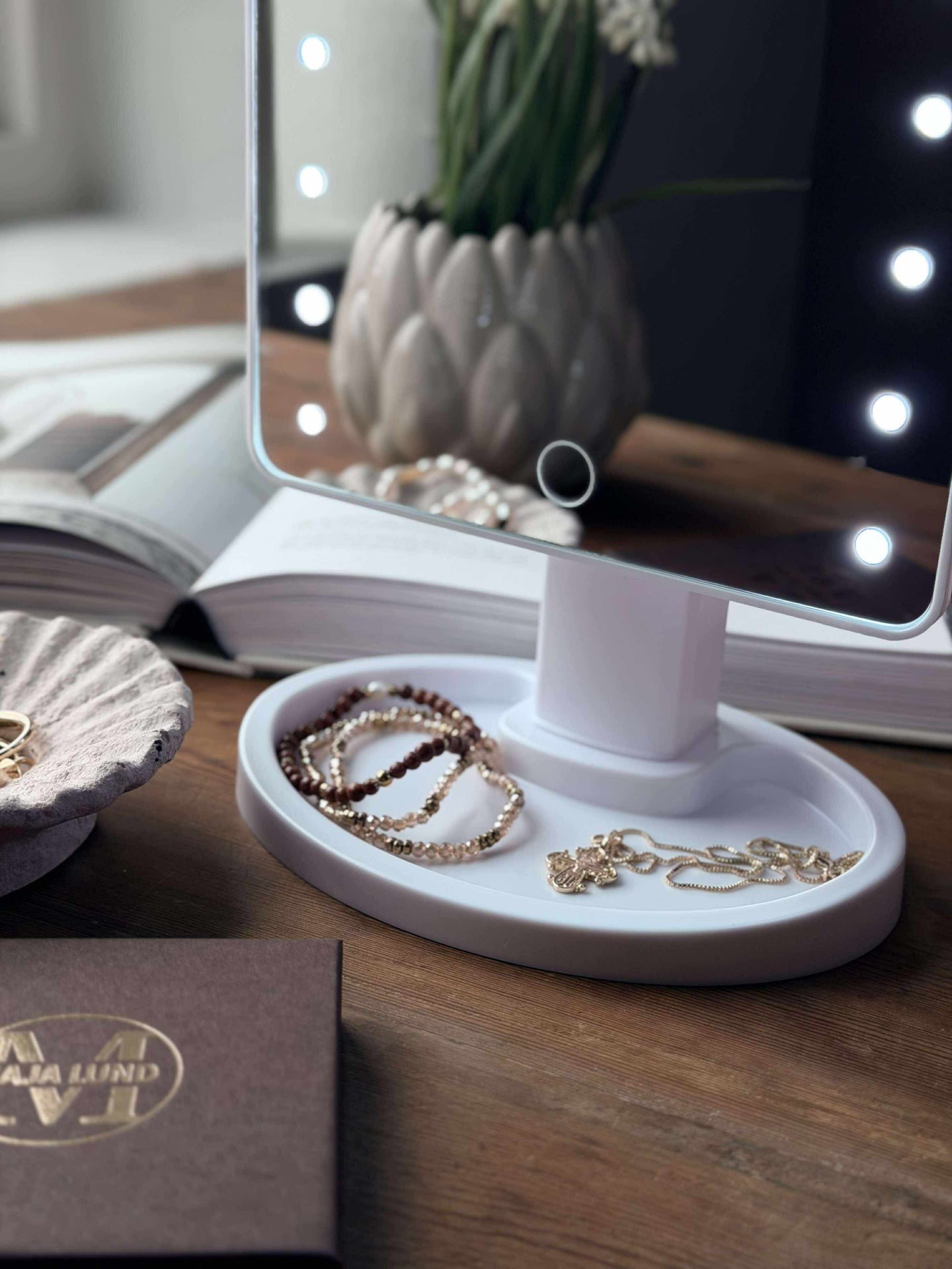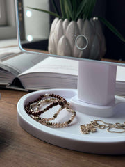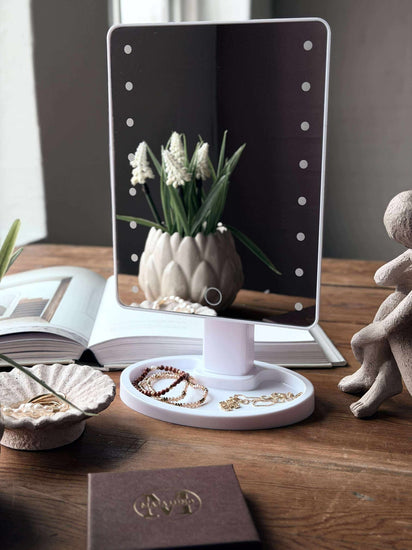- Foten på makeupspeilet har en praktisk hylle til smykker