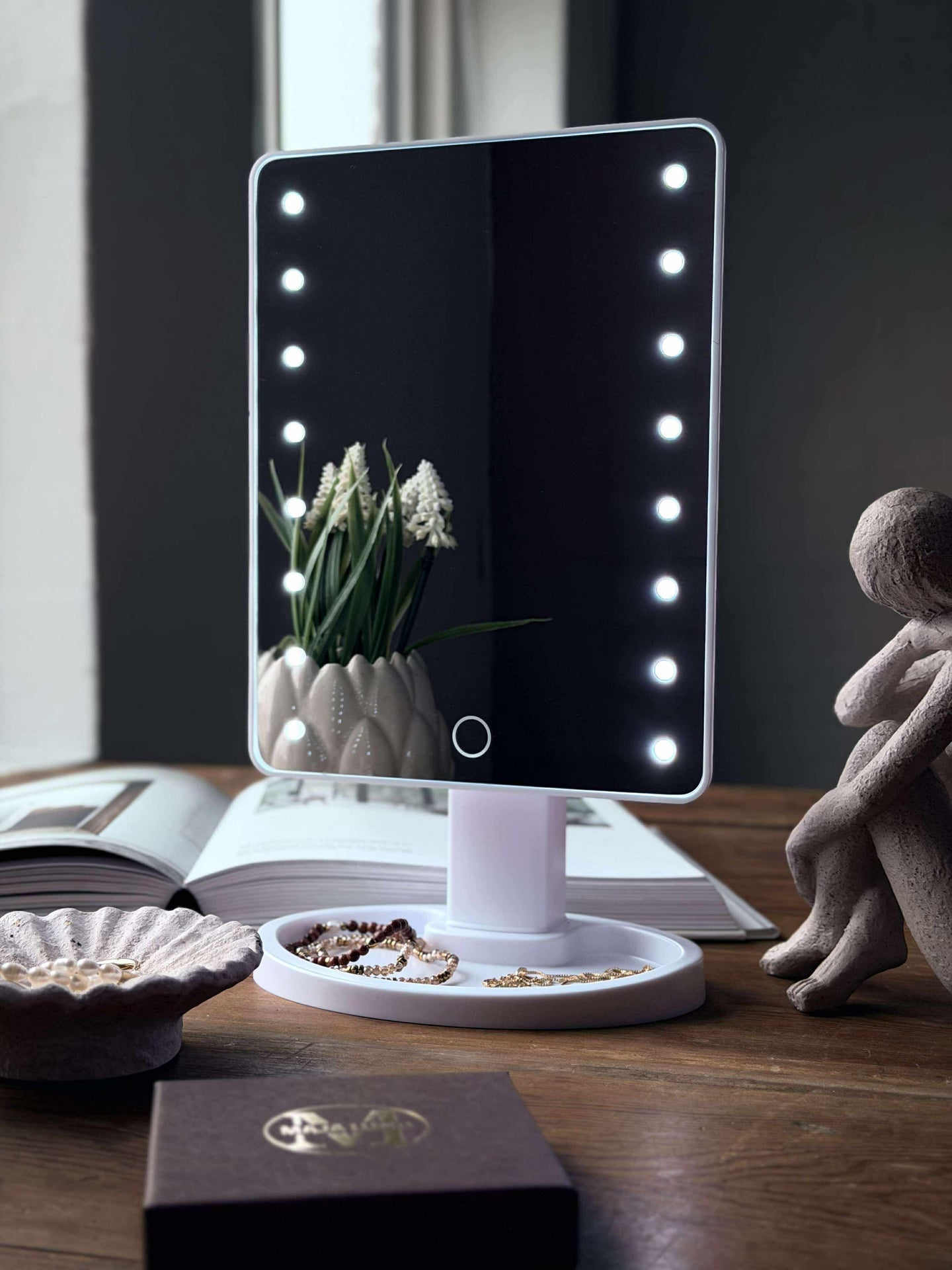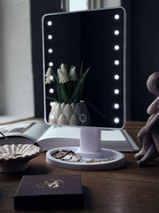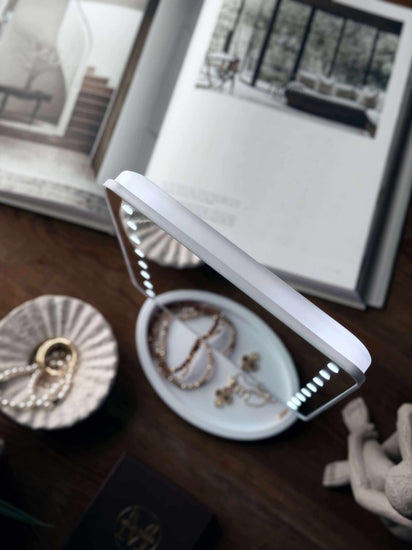 Er du lei av dårlig belysning når du legger sminke eller pynter deg? Dette sminkespeilet gir deg klart lys akkurat der du trenger det, samtidig som det tilbyr en praktisk oppbevaringsløsning for smykker. Det er ideelt for den organiserte skjønnhetsrutinen.