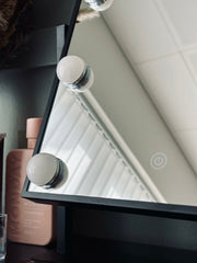 Sminkespeilet er laget av svart metall, noe som gir det et moderne og stilrent utseende. Materialet er robust og holdbart, noe som gjør det ideelt for daglig bruk på badet. Den svarte fargen komplementerer ulike interiørstiler og tilfører et sofistikert preg. Metallkonstruksjonen gir også speilet en stabilitet som sikrer en jevn og trygg sminkeopplevelse.