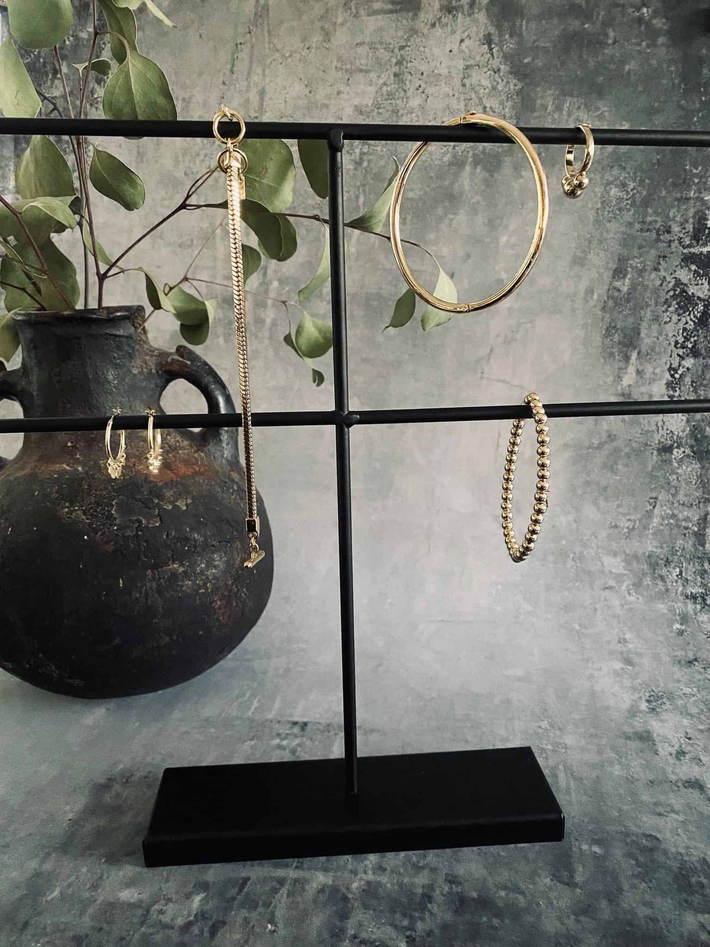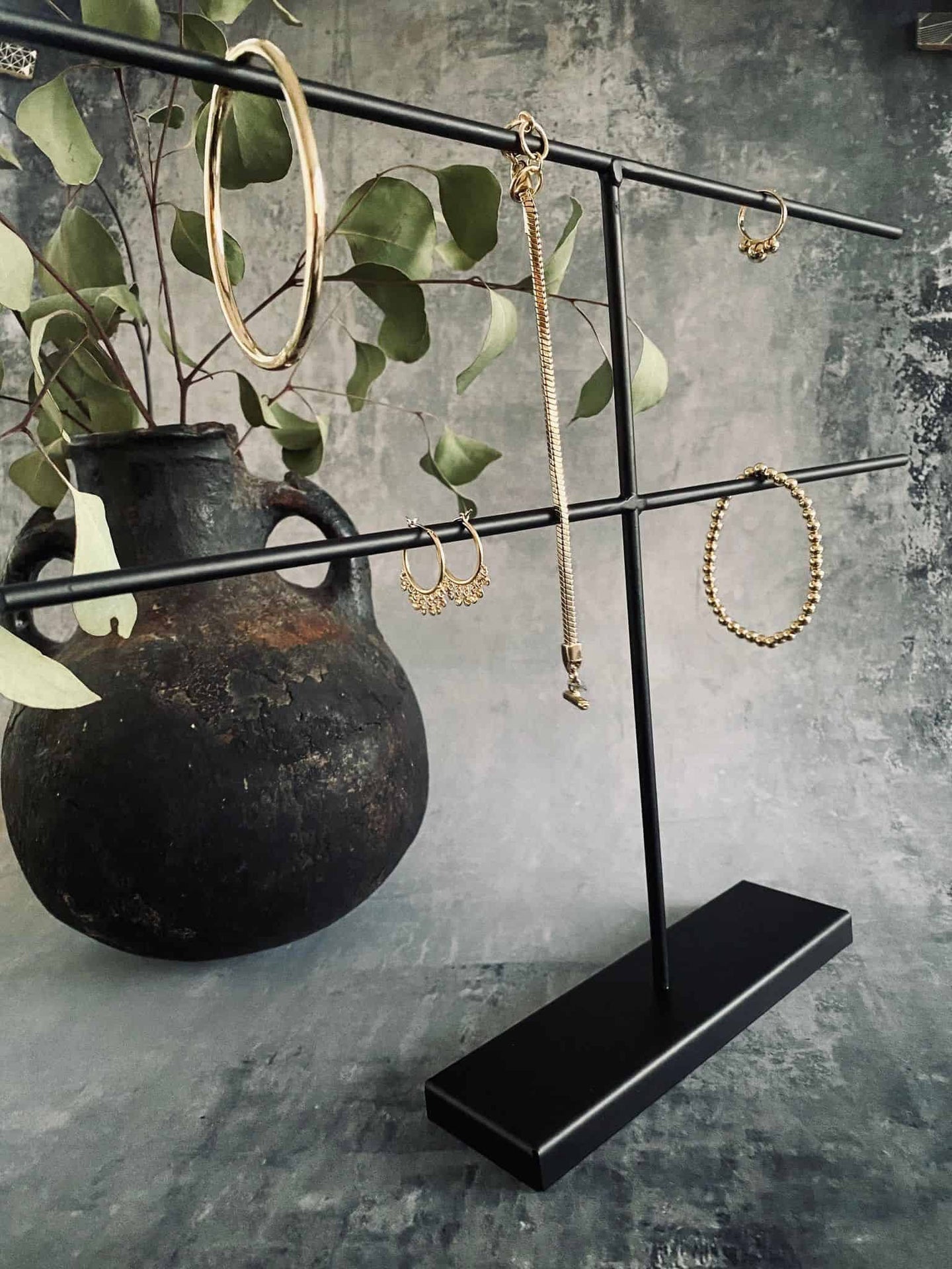 Med vårt smykkestativ i svart metall kan du enkelt holde orden på smykkene dine. Stativet er designet for å gi deg en praktisk og stilfull måte å oppbevare smykkene dine på.