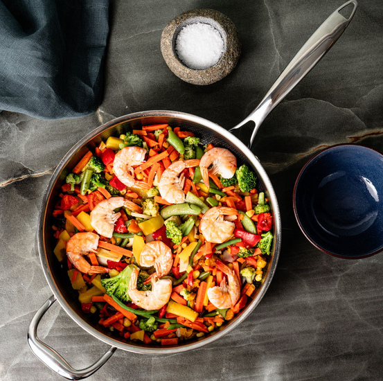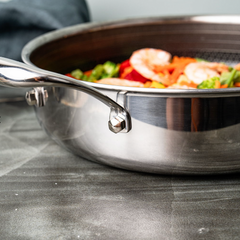 Den hybride sauterpannen er konstruert med tre lag kvalitetsstål, inkludert rustfritt stål og aluminium. Denne kombinasjonen sikrer effektiv og jevn varmefordeling, noe som gir en mer kontrollert matlagingsopplevelse. Med rustfritt stål får du holdbarhet og motstandsdyktighet mot korrosjon, mens aluminiumen bidrar til rask oppvarming. Dette gir en balanse mellom styrke og funksjonalitet, som gjør matlagingen enklere og mer effektiv.