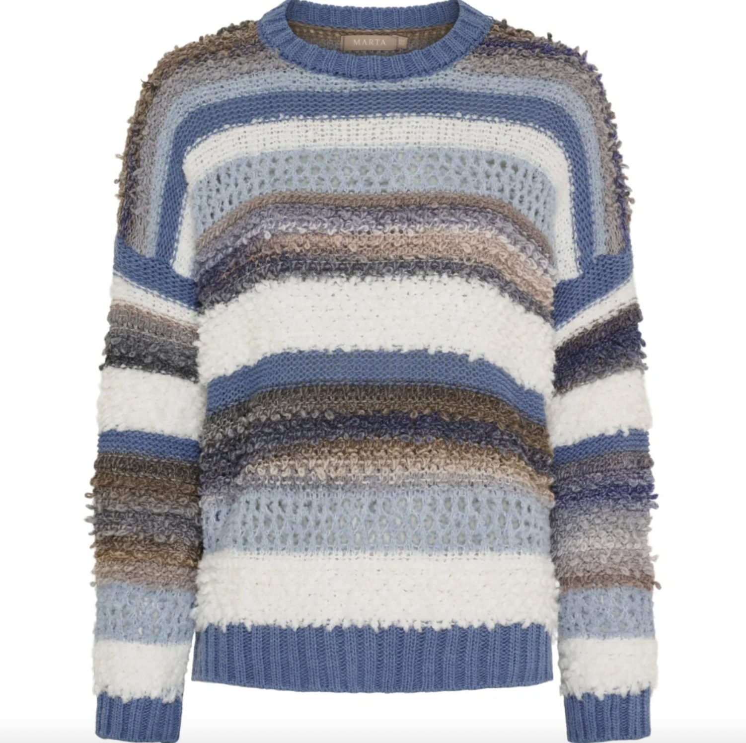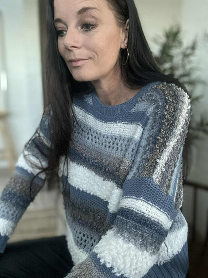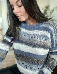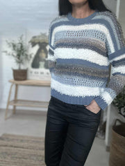 Strikk Bianco - Jeans Grey er en super deilig strikk i onesize med regular passform. Den grå fargen og det stripete mønsteret gir et rolig, klassisk uttrykk som er lett å style i garderoben.