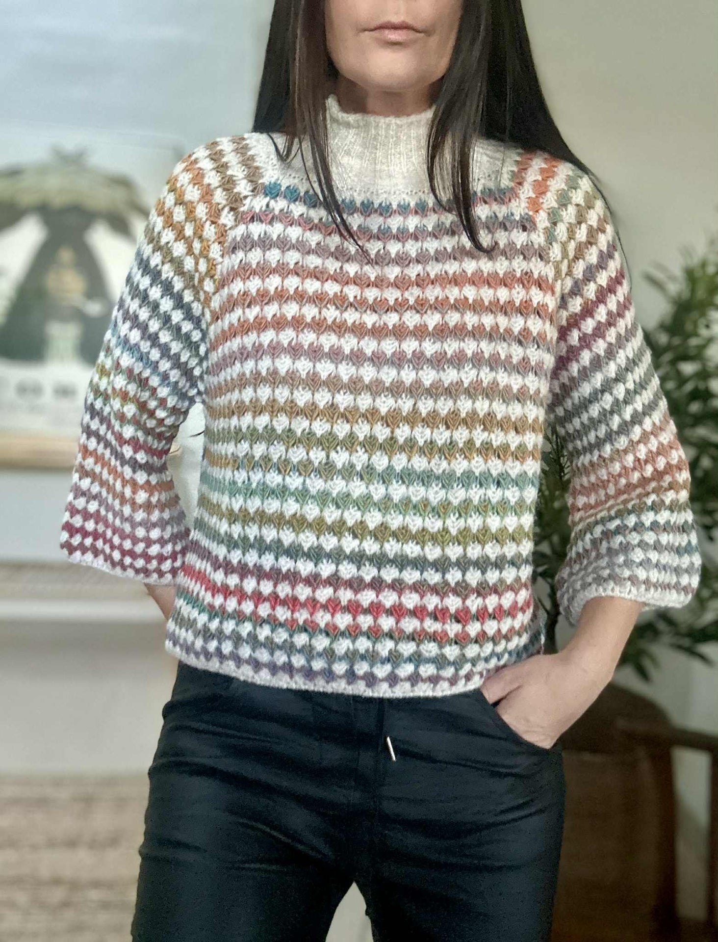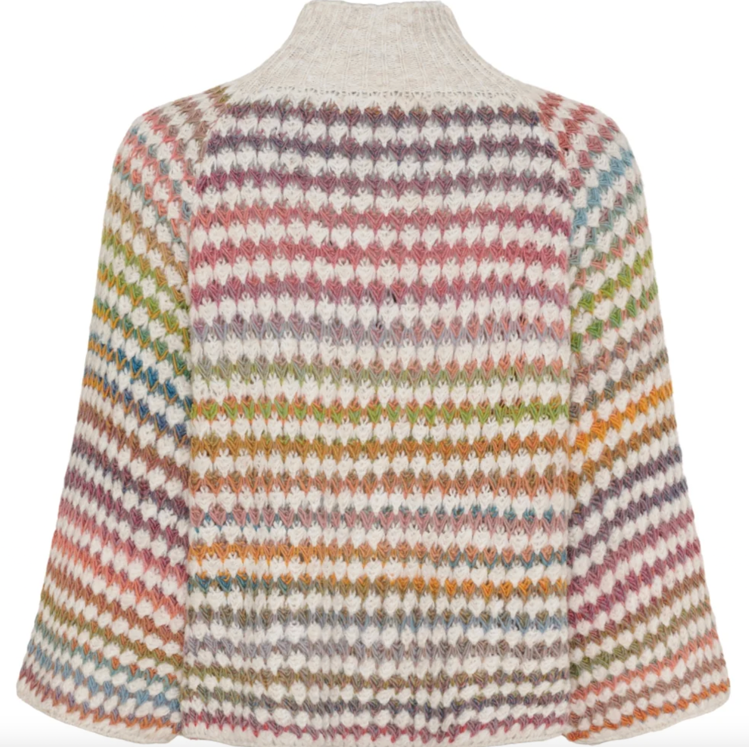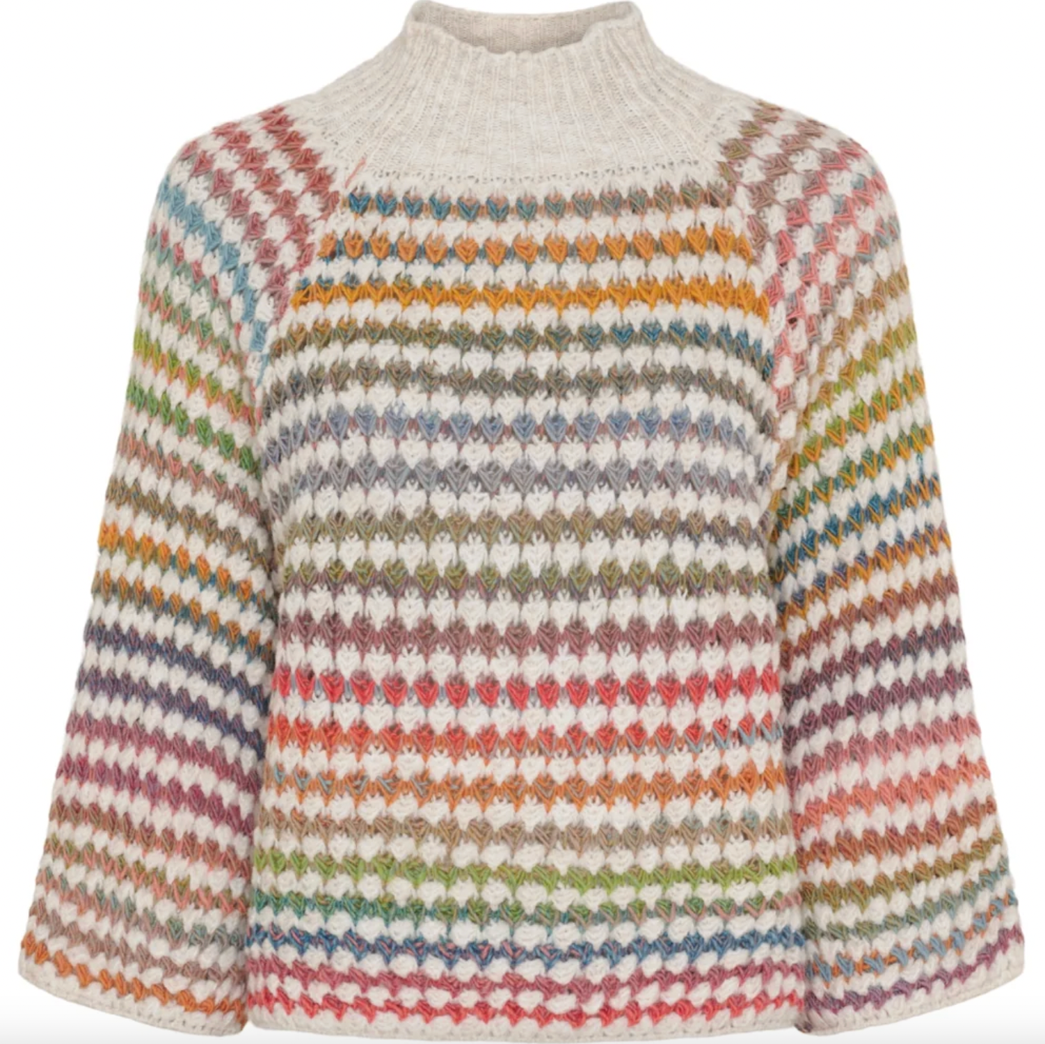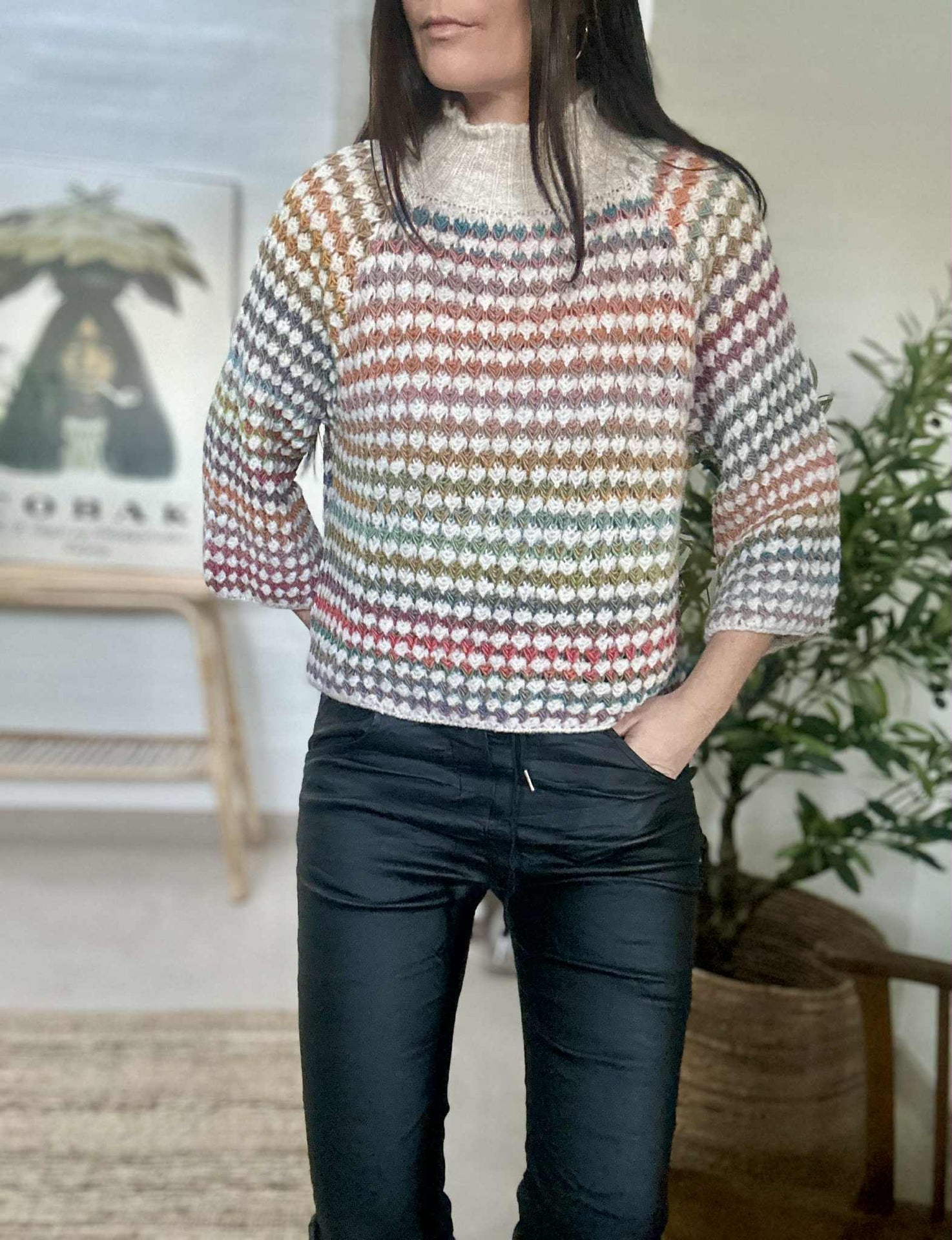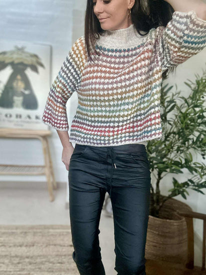 Strik Color Cream er en super deilig strikkegenser i onesize med et flerfarget print, som gir et levende og personlig uttrykk. Den er strikket i ull og har en høy hals samt 3/4-lange ermer, noe som gjør den lett å bruke på tvers av sesonger og styling.