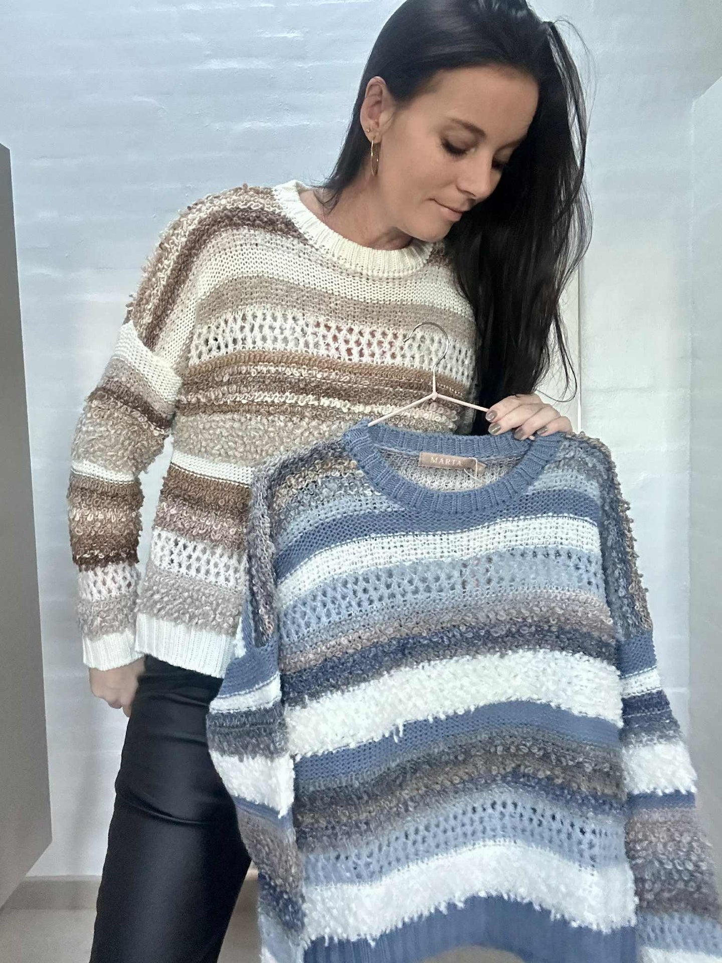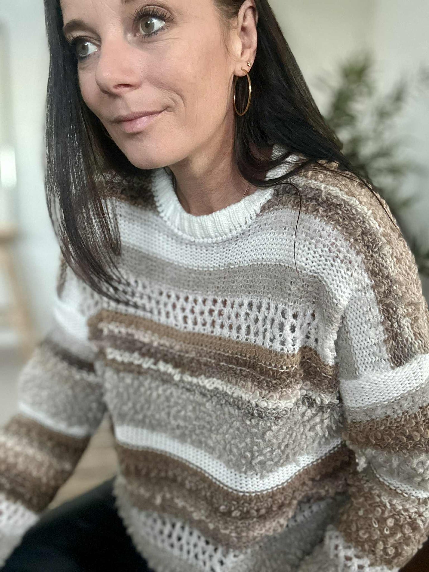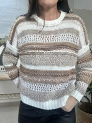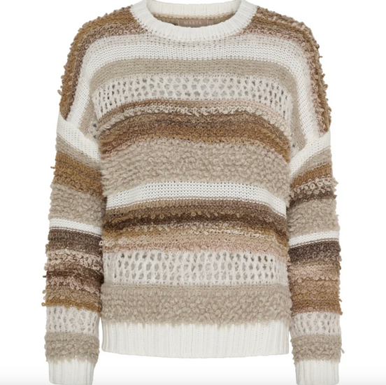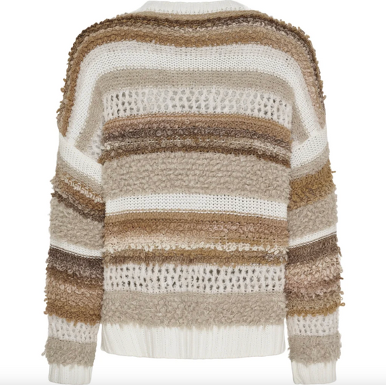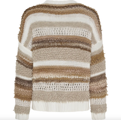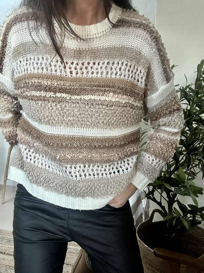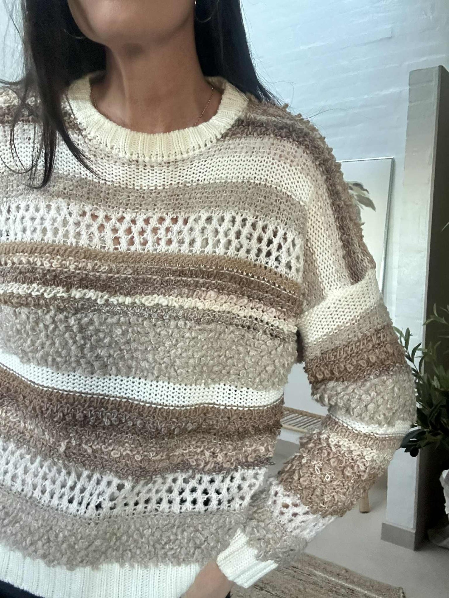 Strik Bianco - Camello er en super deilig strikk i onesize med et oversized uttrykk. Den beige fargen og det stripete mønsteret gir et rolig, klassisk uttrykk som er enkelt å style i garderoben.