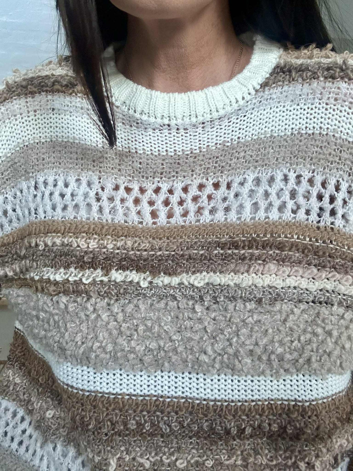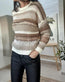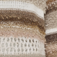 Strikken er laget i ull og har et stripete mønster i beige nyanser.