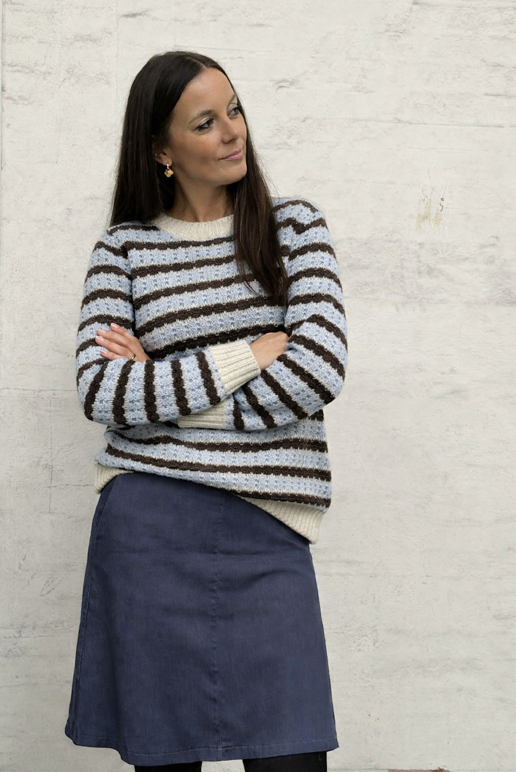 Kombinasjonen av 50% bomull og 50% akryl gir en strikk med et lett og behagelig uttrykk. De markante stripene tilfører et enkelt, grafisk look, som står flott alene eller under en jakke.