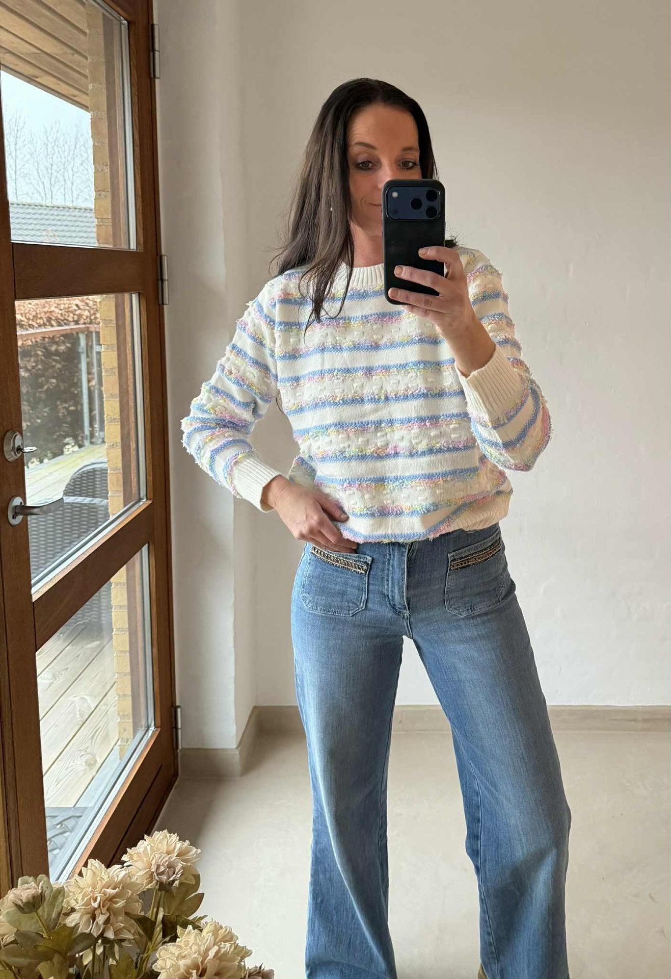 Med sin teksturerte strikk får du en søt genser som tilfører litt ekstra spill til et enkelt look – uten at det blir for mye.