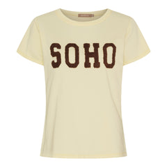 T-skjorte SOHO - Gul / Moro er en enkel, kortermet T-skjorte i bomull med print. Fargen er gul, og passformen er regular, så den ligger naturlig og avslappet på kroppen. En fin hverdagsfavoritt som er enkel å style i garderoben.