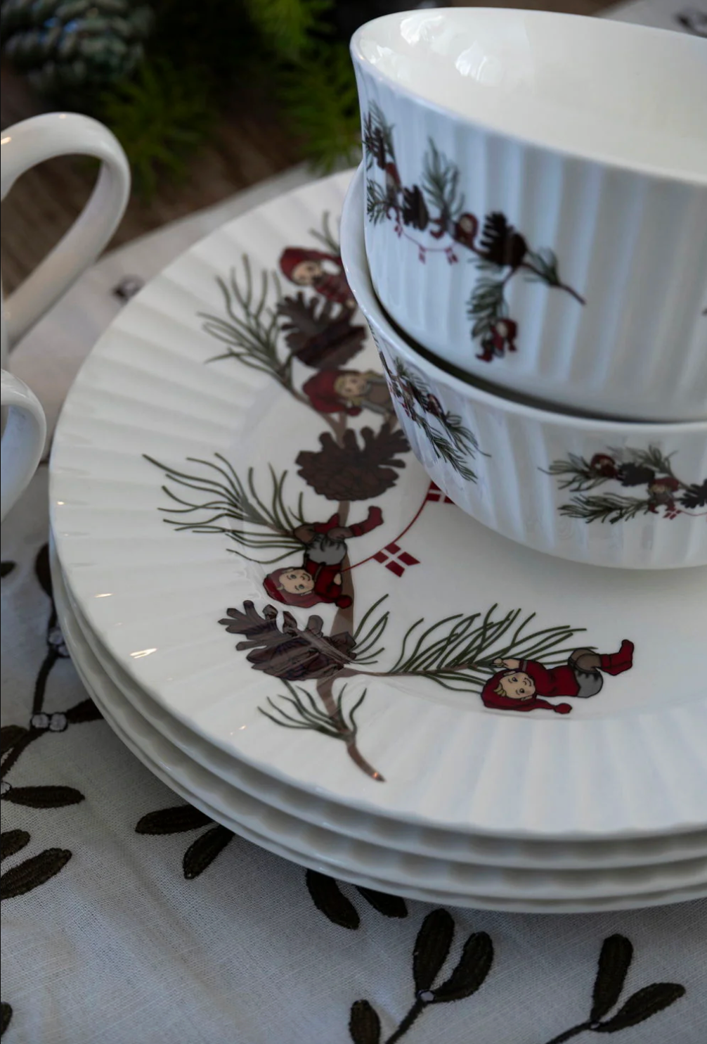 Newbone-porselen gir tallerkenen en robust og holdbar struktur, samtidig som den beholder en delikat estetikk. Materialet har en naturlig glans som fremhever julens dekorasjoner på en subtil måte. Dette porselenet tåler både varme og kalde retter, noe som gjør det allsidig for ulike serveringssituasjoner. Tallerkenens overflate er enkel å rengjøre, noe som bidrar til praktisk bruk i hverdagen.
