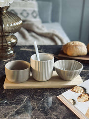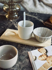 Skap en rolig og innbydende servering med dette tapassettet i bambus. Settet består av et rundt bambusfat i naturfarge og 3 matchende skåler i et enkelt, ensfarget uttrykk. En fin løsning når du vil samle små serveringer på ett sted.