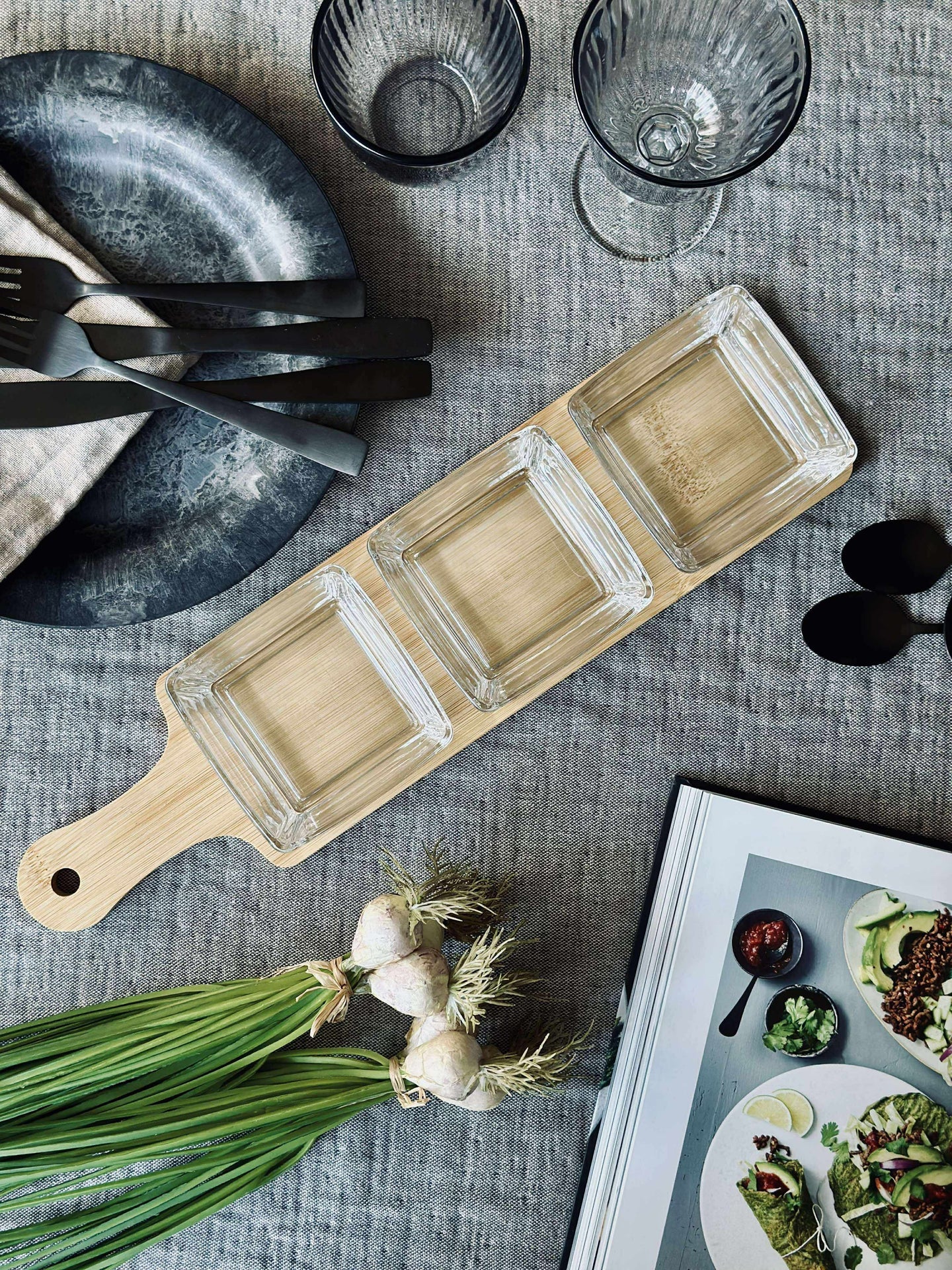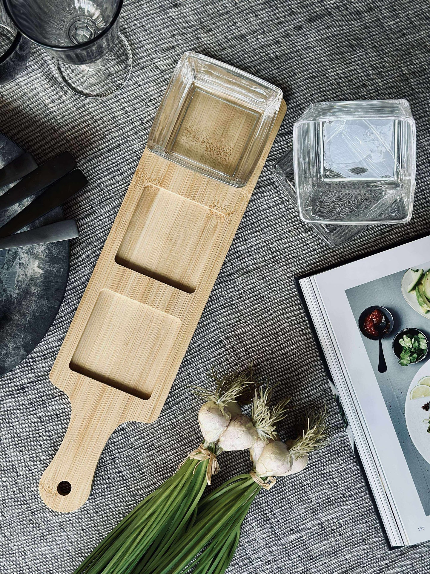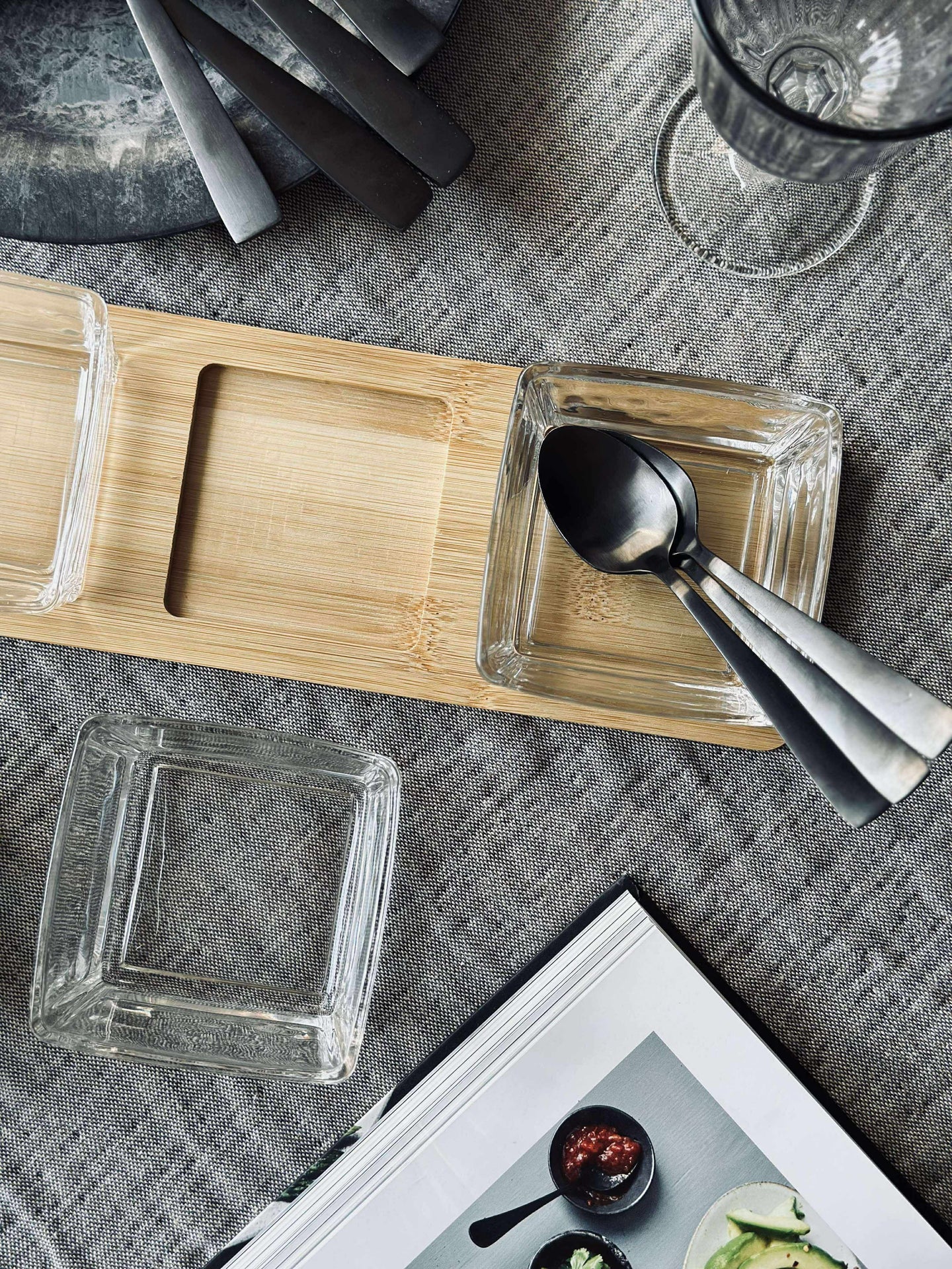 Serveringssett med bambus og glasskåler