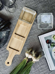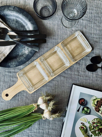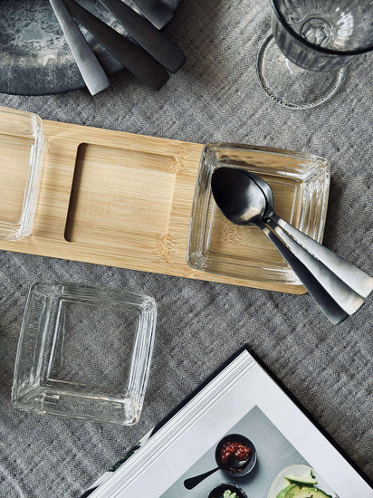 Dette serveringssettet inkluderer fire glasskåler og et brett laget av bambus, noe som gir en naturlig og tidløs følelse til borddekkingen. Glasskålene er ideelle for å presentere ulike småretter eller snacks, mens bambusbrettet gir en stabil base og enkel transport. Materialvalget sikrer både holdbarhet og enkel rengjøring, noe som gjør serveringssettet praktisk for både hverdagsbruk og spesielle anledninger.