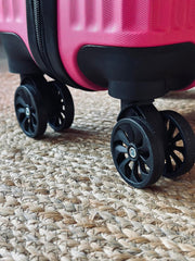 Kofferten er laget av plast og har et ensfarget utseende i rosa.