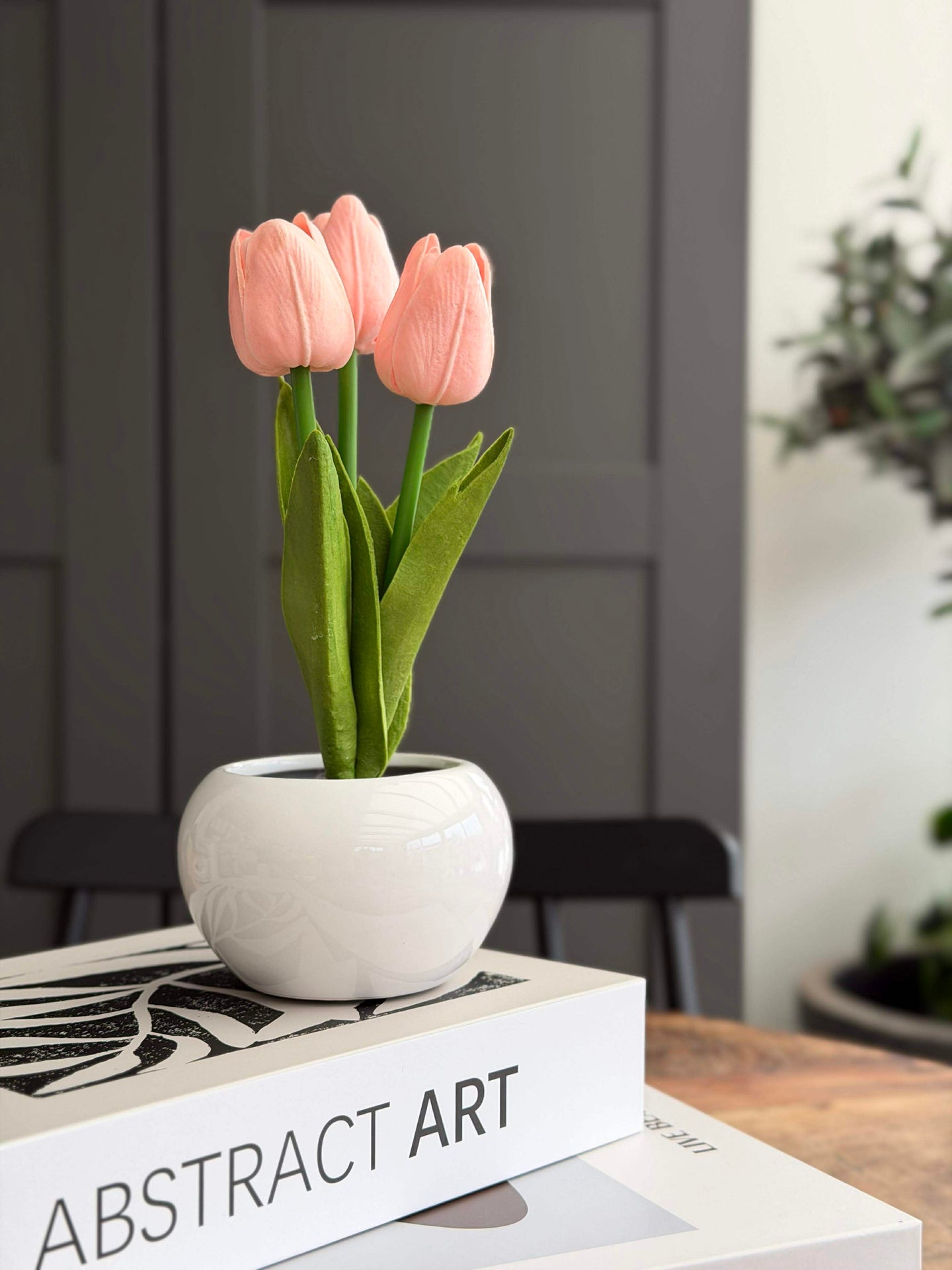 Uttrykket er lett og våraktig med rosa tulipaner som kombinerer blomsterutseende med integrerte LED-lys for en koselig, dekorativ effekt.