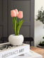 Tulipaner med lys - Rosa er en dekorativ potte med 3 tulipaner og LED-lys. Den rosa fargen gir et mykt uttrykk som tilfører varme og stemning til innredningen.