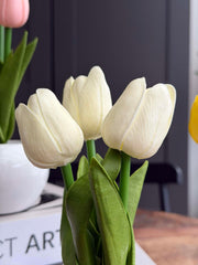 Tulipaner med lys - Hvit er en liten potte med 3 tulipaner med LED-lys, som skaper et fint, dekorativt uttrykk i innredningen. Den hvite fargen gir et rolig og enkelt uttrykk, som er lett å plassere sammen med både lyse og mer fargerike detaljer.