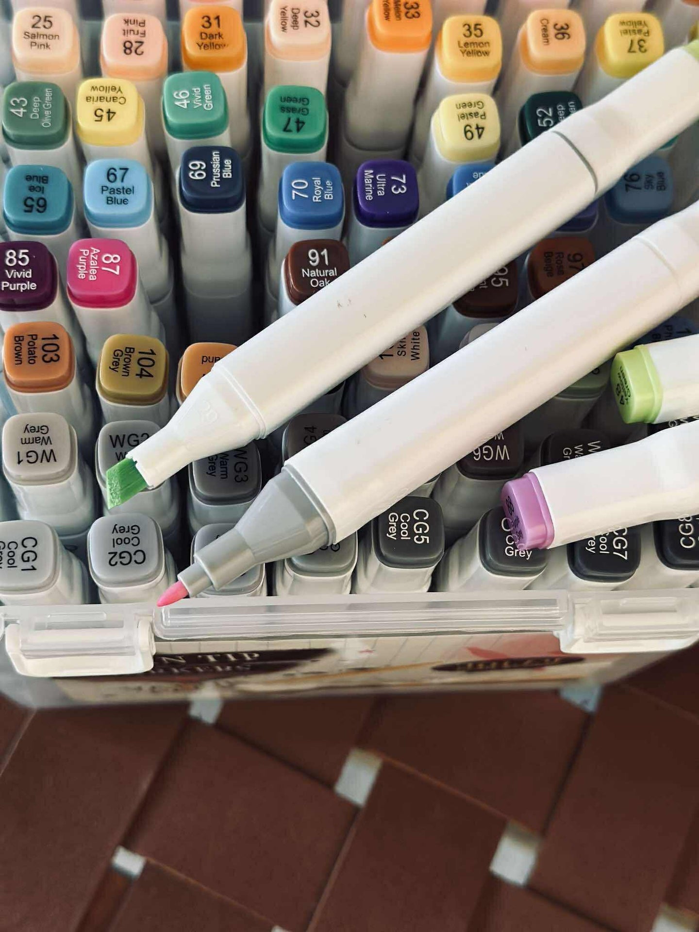 Tusjen er tynn i den ene enden og bred i den andre, noe som gir en fleksibel strek i samme tusj. En praktisk løsning når du ønsker å ha tusjer i eske og samtidig holde orden på oppbevaringen av tusjene — er dette noe for deg?