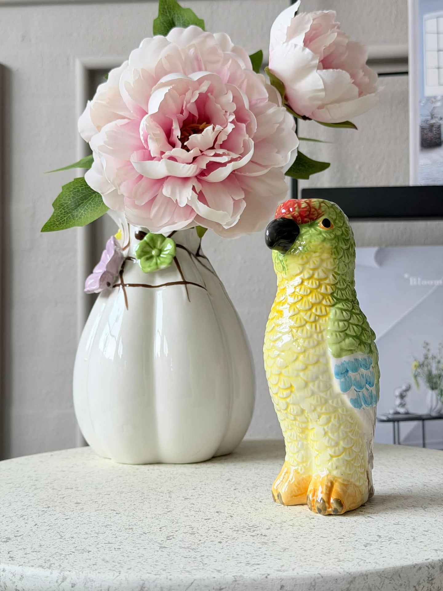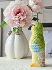 Vasen er laget i keramikk og har et dekorativt papegøyemotiv, som gir den et karakterfullt uttrykk og gjør den til et opplagt blikkfang i hjemmet.